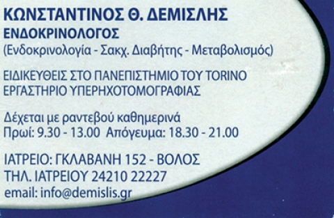 Ο Ιατρός Ενδοκρινολόγος Κωνσταντίνος Δεμισλής, γεννήθηκε στην πόλη του Βόλου όπου και αποπεράτωσε τις βασικές του σπουδές. Κατά το ακαδημαϊκό έτος 78-79 έκανε την εγγραφή του στο 1ο έτος της Ιατρικής Σχολής του Πανεπιστήμιου του Torino (Ιταλία) απ’ όπου και αποφοίτησε το 1985, με βαθμό πτυχίου 100/110 παρουσιάζοντας ερευνητική πτυχιακή εργασία στο γνωστικό αντικείμενο της Νευροενδοκρινολογίας, με τίτλο: "Ρύθμιση της έκκρισης της αυξητικής ορμόνης (GH) από το κεντρικό Χοληνεργικό σύστημα στον άνθρωπο". Διετέλεσε μέλος επιστημονικής ερευνητικής ομάδας και έλαβε μέρος σε σειρά επιστημονικών ερευνητικών πρωτοκόλλων που ετύγχαναν υποτροφίας, από το Ιταλικό Υπουργείο Παιδείας, με σκοπό τη μελέτη του αδρενεργικού συστήματος στη ρύθμιση της έκκρισης της αυξητικής ορμόνης (GH) σε φυσιολογικές και παθολογικές συνθήκες.