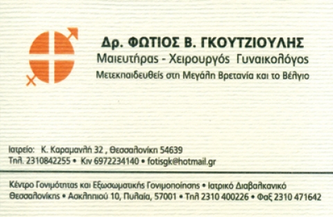 Ο μαιευτήρας - χειρουργός γυναικολόγος Dr Γκουτζιούλης Φώτιος διατηρεί ένα πλήρως εξοπλισμένο ιατρείο στην οδό Κωνσταντίνου Καραμανλή 32, στη Θεσσαλονίκη. Σ’ έναν ζεστό και φιλικό χώρο, ο ιατρός παρέχει ιατρικές υπηρεσίες υψηλών προδιαγραφών, με πρωταρχικό μέλημα τη διαφύλαξη της γυναικείας υγείας.