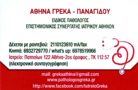 Ιατρειο Πατησιων 122(σταση Αγγελοπουλου) Δέχεται (χωρις ραντεβου) Δευτέρα 18:00 - 20:00, Τετάρτη και Πέμπτη 16:00 - 18:00 Παρασκευή 16:00 - 18:00 κατόπιν ραντεβού. Ολα τα πρωινά καθως και Τριτη 10-7 μμ η ιατρος δέχεται με ραντεβου στο γραφειο της Κηφισιας 56 και Δελφων Ειδικος Παθολογος-επιστημονικος συνεργατης Ιατρικου Αθηνων Εξειδικευση Διατροφολογια (λιπομετρηση-μεταβολισμος-εξατομικευμενη διατροφη) Μaster Γεροντολογια-αντιγηρανση