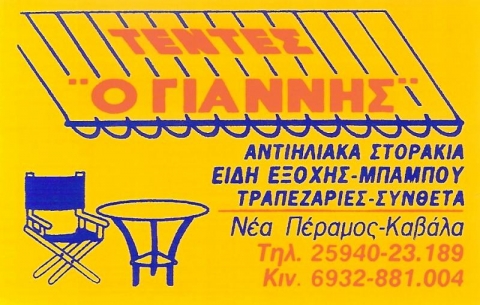 Στην επιχείρηση ΤΕΝΤΕΣ Ο ΓΙΑΝΝΗΣ που εδρεύει στην Νέα Πέραμο της Καβάλας, δεν σταματούμε να ερευνούμε τις τάσεις της αγοράς αλλά και τις νέες ανάγκες που δημιουργούνται. Αναζητούμε συνεχώς καινούρια προϊόντα για να καλύψουμε όλες σας τις απαιτήσεις και εισάγουμε κάθε πρωτοποριακή τεχνολογία σε όλη την γκάμα των προϊόντων μας. Η πολύχρονη πείρα μας, εγγυάται τη σωστή τοποθέτηση και εγκατάσταση της τέντας.