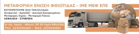 Η μεταφορική μας εταιρεία δραστηριοποιείται εδώ και χρόνια στο χώρο των μεταφορών.Για όλους όσους απαρτίζουμε τη Μεταφορική Ένωση Φθιώτιδας δεν υπάρχει μεγαλύτερη δικαίωση από τη δική σας ικανοποίηση. Έτσι, προσβλέπουμε σε μία εποικοδομητική συνεργασία μαζί σας, η οποία θα ικανοποιεί κάθε σας ανάγκη για μια έγκαιρη, οικονομική και χωρίς προβλήματα μετακόμιση. Απευθυνόμαστε τόσο σε ιδιώτες όσο και επιχειρήσεις και είμαστε ανά πάσα στιγμή έτοιμοι να ολοκληρώσουμε αποτελεσματικά μεταφορές, αποθηκεύσεις, διανομές, φορτώσεις/εκφορτώσεις, συσκευασίες και ό, τι άλλο μας ζητηθεί. Επικοινωνήστε μαζί μας να φροντίσουμε τη μετακόμιση σας και να σας δώσουμε μια λογική τιμή.Η μεταφορική μας εταιρεία δραστηριοποιείται εδώ και χρόνια στο χώρο των μεταφορών.
