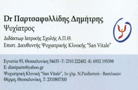 Διδάκτωρ Α.Π.Θ. επιστημονικός Δ/ντης της ψυχιατρικής κλινικής San Vitale.Δέχεται Δευτέρα, Τρίτη, Πέμπτη 17:00 -21:00.Αντιμετώπιση των ακολούθων καταστάσεων εξατομικευμένα, με ψυχοθεραπεία ή/και φαρμακευτική αγωγή:
